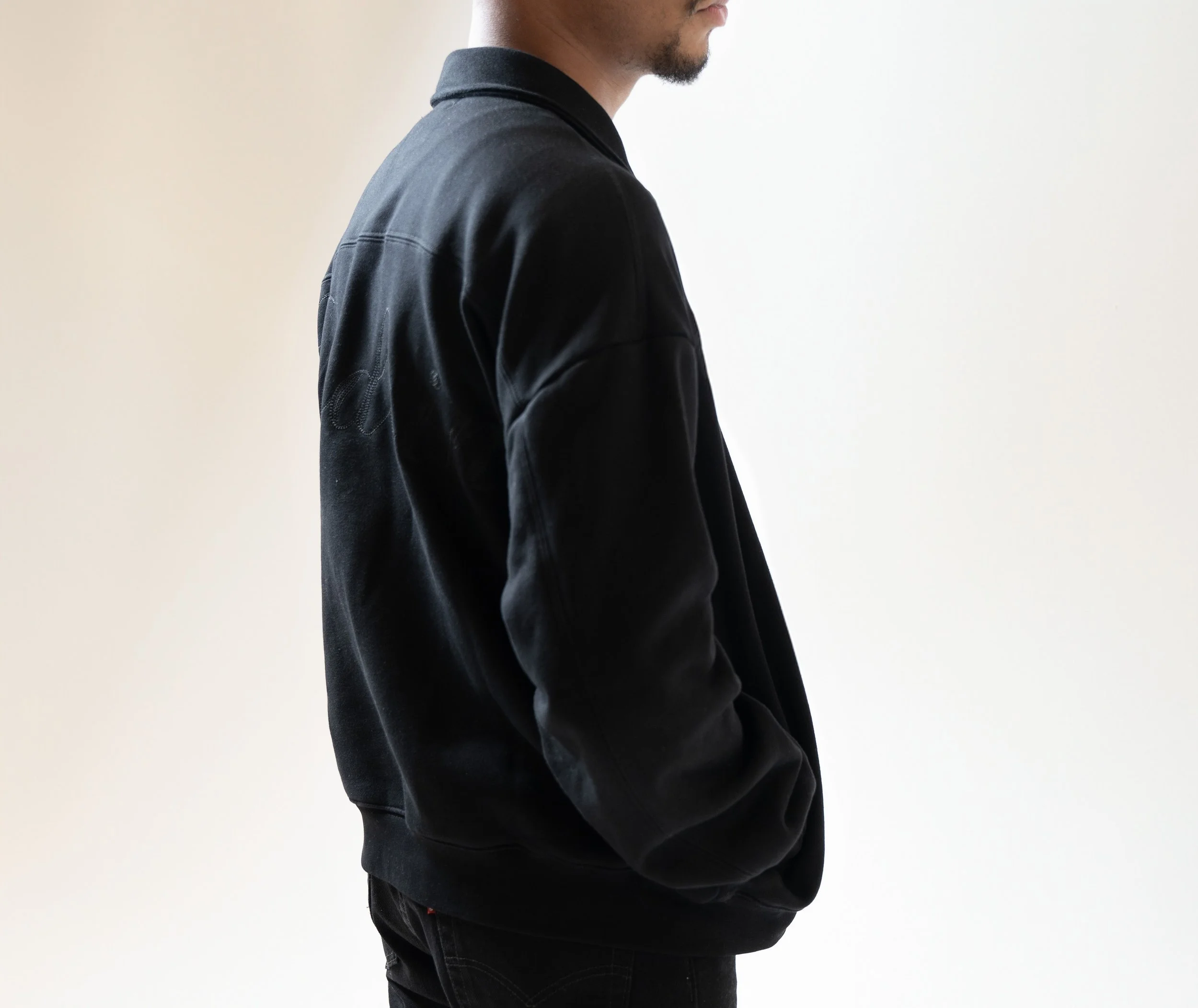 Heavyweight Quater-Zip Jacket. DISDAIN Cursive Logo 3D Embroidered On The Front. DISDAIN Cursive Logo Ghost Chain Stitch Embroidered On The Back. With Custom DISDAIN Barbed Wire Knot Zipper Hardware.